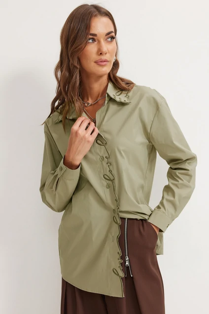 Стильная блузка прямого силуэта из хлопковой ткани с фигурным низом. Воротник на стойке с застежкой по центру на петли и пуговицы. Рукав со спущенной линией плеча, по низу манжета с застежкой на петлю и пуговицу. На спинке фигурная кокетка. По переду на планке и на воротнике - дизайнерская вышивка. Длина блузки 70 см во всех размерах