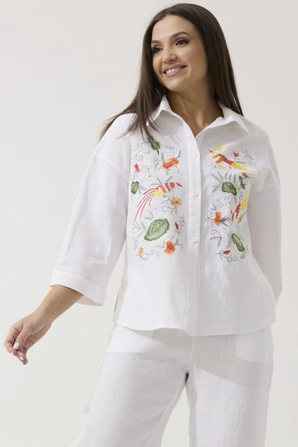 Воротник отложной рубашечного типа. Застежка центральная на петли и пуговицы, спинка с кокеткой. На полочке расположены две симметричные дизайнерские вышивки. Рукав 3/4 со спущеной линией плеча, одношовный.