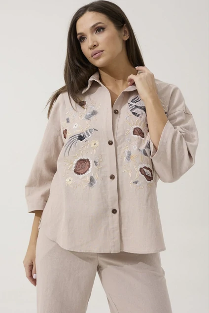 Воротник отложной рубашечного типа. Застежка центральная на петли и пуговицы, спинка с кокеткой. На полочке расположены две симметричные дизайнерские вышивки. Рукав 3/4 со спущеной линией плеча, одношовный.