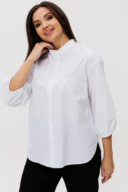 Воротник-стойка. Застежка центральная потайная на петли и пуговицы, спинка с кокеткой. На полочке расположены дизайнерские вышивки. Рукав 3/4 со спущеной линией плеча, одношовный, снизу собран на резинку.