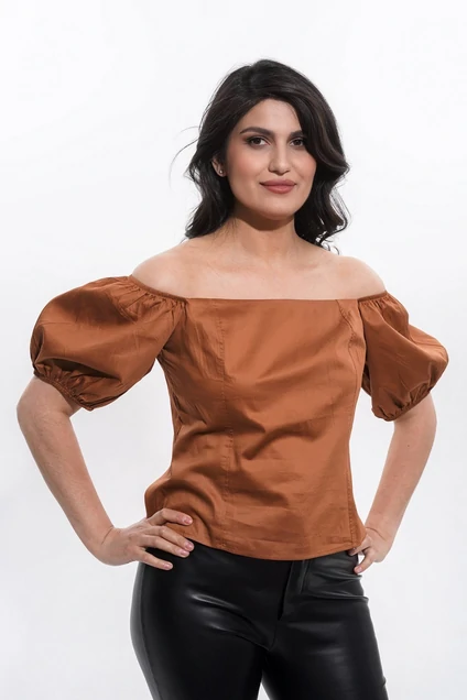 Блуза женская (топ), удлиненный, рукава объемные, на резинке, без застежки. Длина изделия - 41 см, длина рукава - 26 см.
