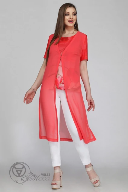 Комплект женский, жилет и блуза. Жилет удлененный из шифона, вырез горловины V-образный.Край борта и боковые срезы обработаны отрезными планками. Застегивается жилет на 2 декоративные металлические застежки. Спинка на кокетке,на нижней детали по центру спинки. Спинка и полочка скреплены по боковому шву декоративными металлическими кольцами. Низ жилета обработан швом в подгибку с закрытым срезом. Блуза без застежки,вырез горловины круглый,обработан обтачками. Полочка,рукава и кокетка спинки из ткани с рисунком "тюльпаны",нижняя часть спинки из шифона со сборкой по центру спинки. Рукав втачной, короткий. Длина блузки по спинке 68см, длина рукава 22см, ширина рукава на уровне глубины проймы 52-36см,54-38см,56-40см. Длина жилета по спинке 114см.