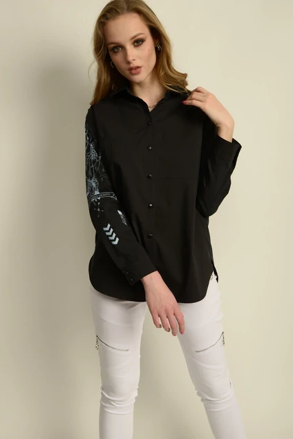Рубашка полуприлегающего силуэта, с втачным рукавом с манжетой, застёжкой. Застёжка центральная на петли и пуговицы, на планке. Правый рукав с принтом "TATOO'. Левая полочка с горизонтальным подрезом и накладным карманом. Воротник отложной на стойке.