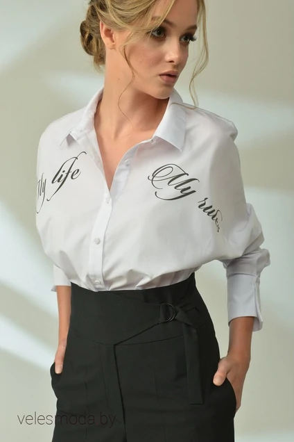 Блузка свободного кроя с цельнокроеным рукавом и центральной застёжкой-планкой на петли и пуговицы. Воротник рубашечного типа. Манжета рукава ассимметричная. По переду выполнена печать художественным шрифтом , в виде фразы на английском языке. "My life My rules" (пер. "Моя жизнь Мои правила")