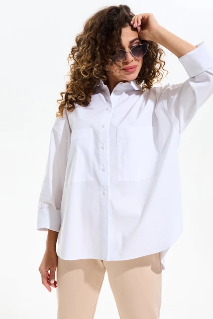 Рубашка женская, свободного кроя, со спущенным плечом. Перед с центральной застёжкой на петли и пуговицы, и настрочными карманами в области груди. Спинка с кокеткой и складкой по центру. Рукав втачной с манжетой по низу. Воротник рубашечного типа. Рубашка, визуально, представляет собой, как бы квадрат.
