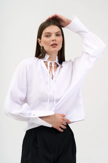 Блузка свободного кроя с цельнокроеным рукавом. Перед разрезной, горловина со сборкой . Воротник — широкая стойка стойка с завязками на шнурки.. Низ рукава со сборкой на широкой манжете с застежкой на 1 петлю и пуговицу. Низ блузки — на подгибке. По боковым швам небольшие разрезы.