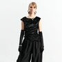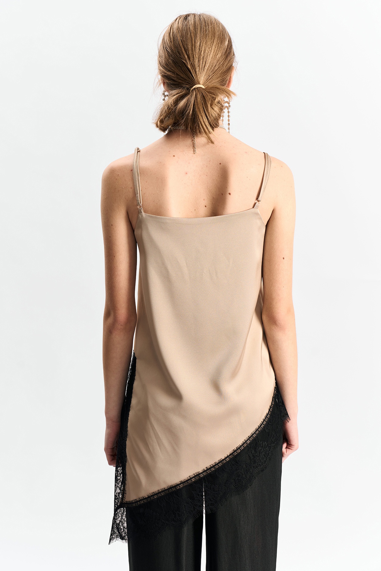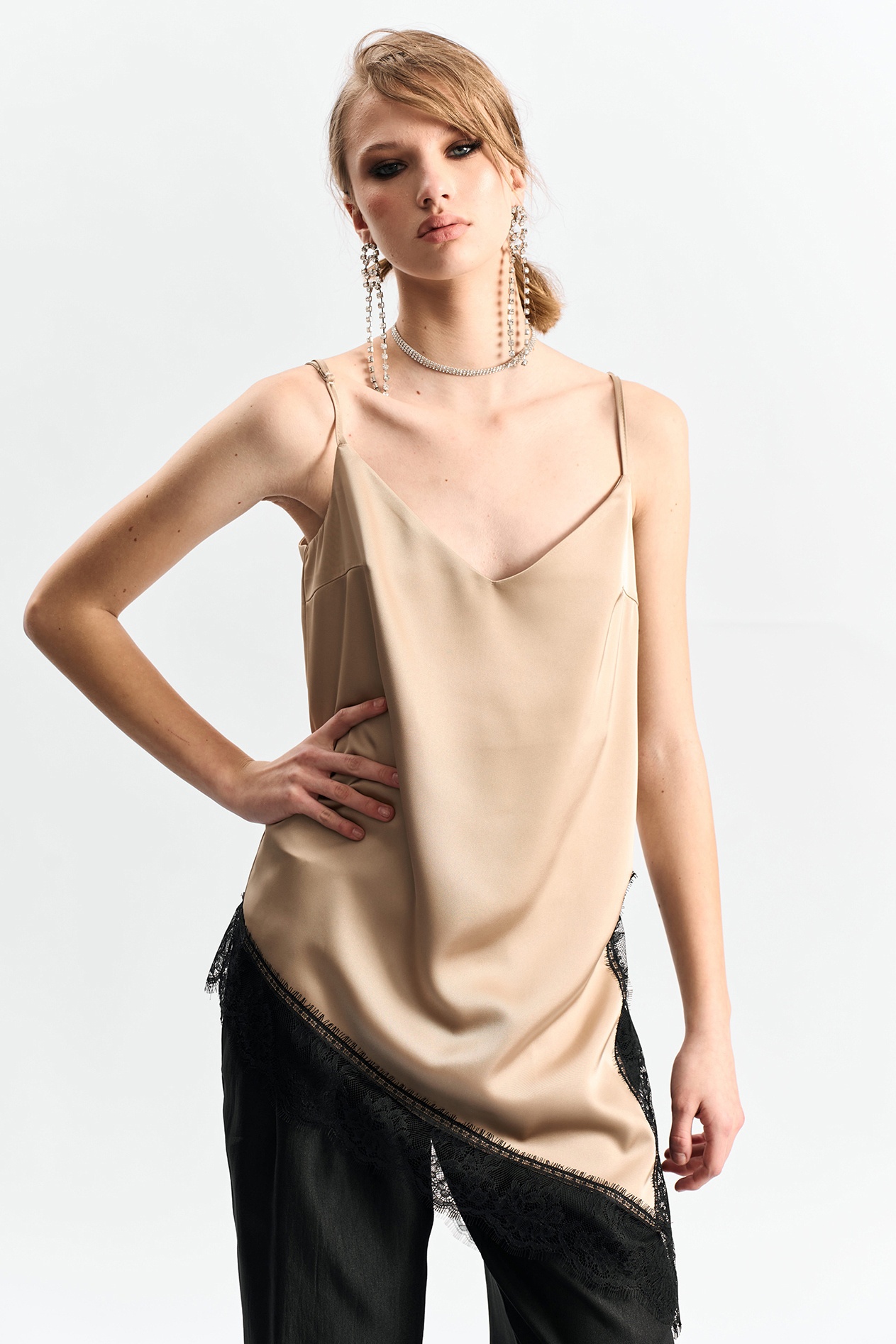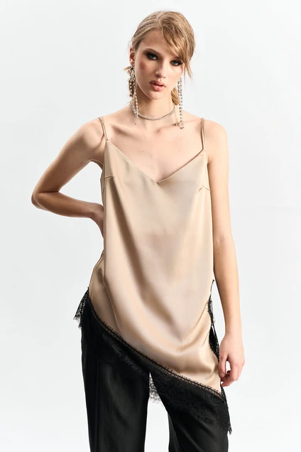 Удлиненная топ-комбинация на тонких спагетти-бретелях, выполненная из высококачественного двустороннего сатина золотисто-бежевого оттенка. Элегантный дизайн обогащен асимметричным низом и декоративным боковым разрезом. По краю изделия добавлено роскошное французское кружево черного цвета, что придает блузке особый шарм и изысканность. Идеальный выбор для создания стильного вечернего образа.