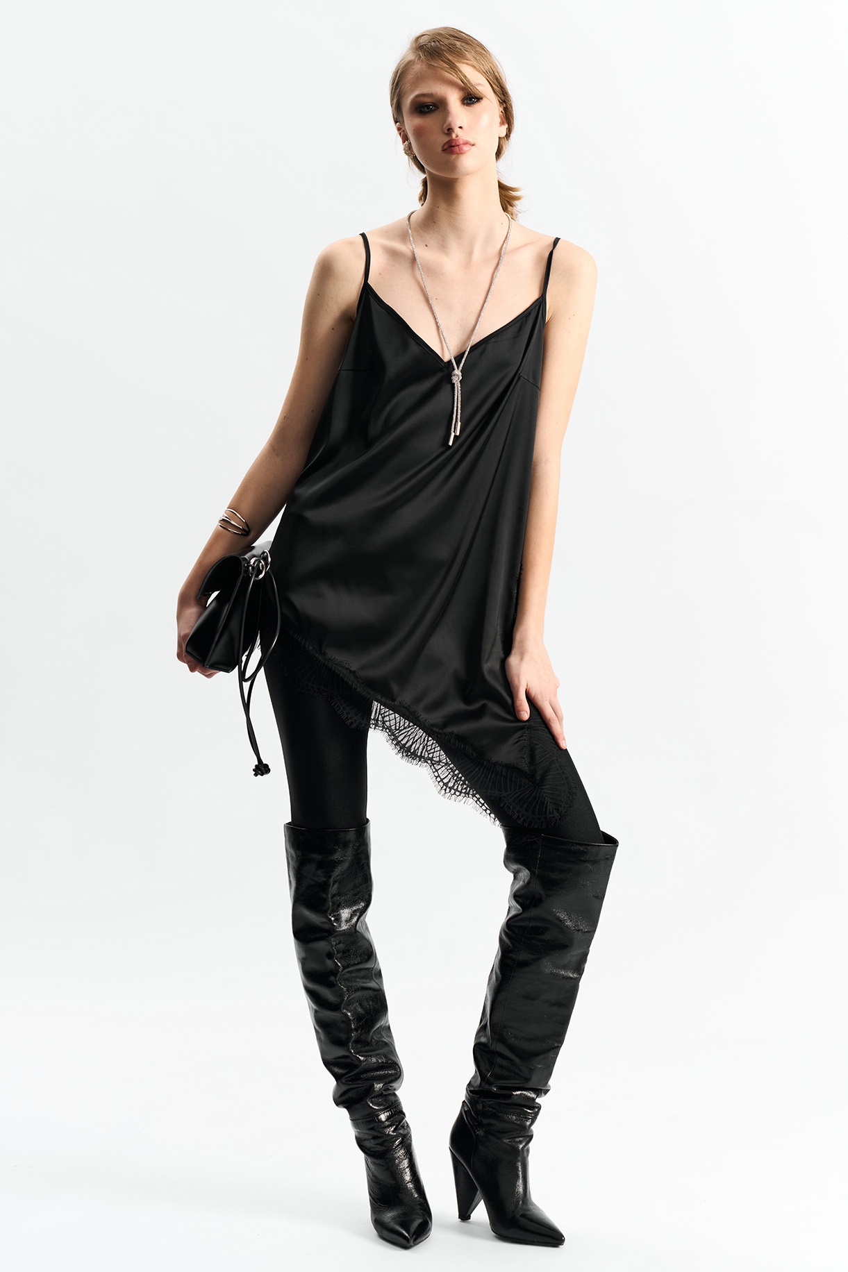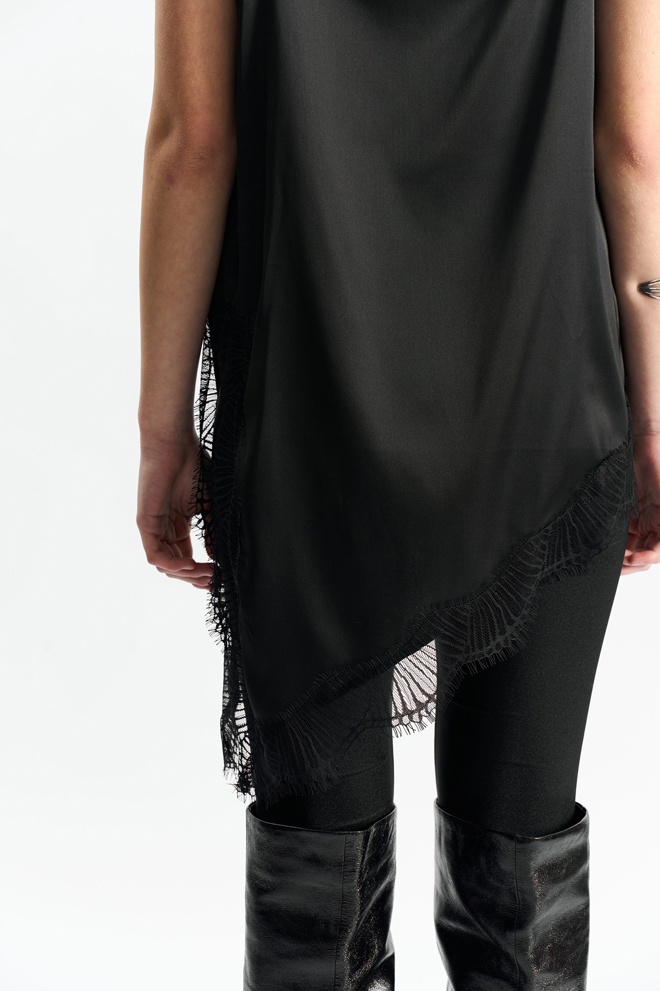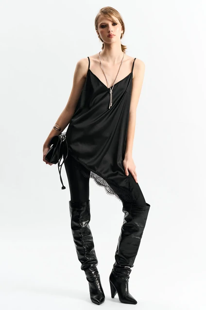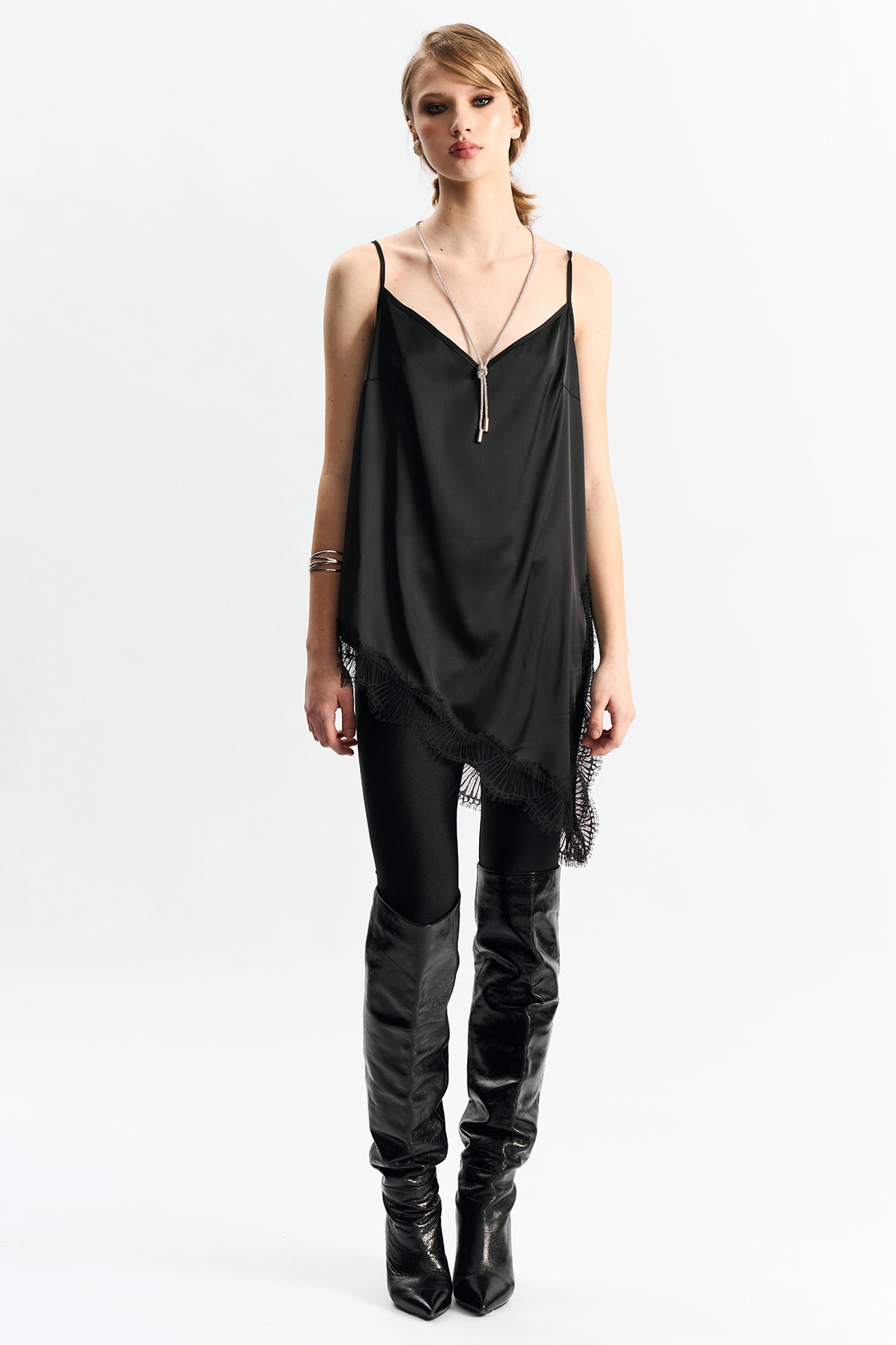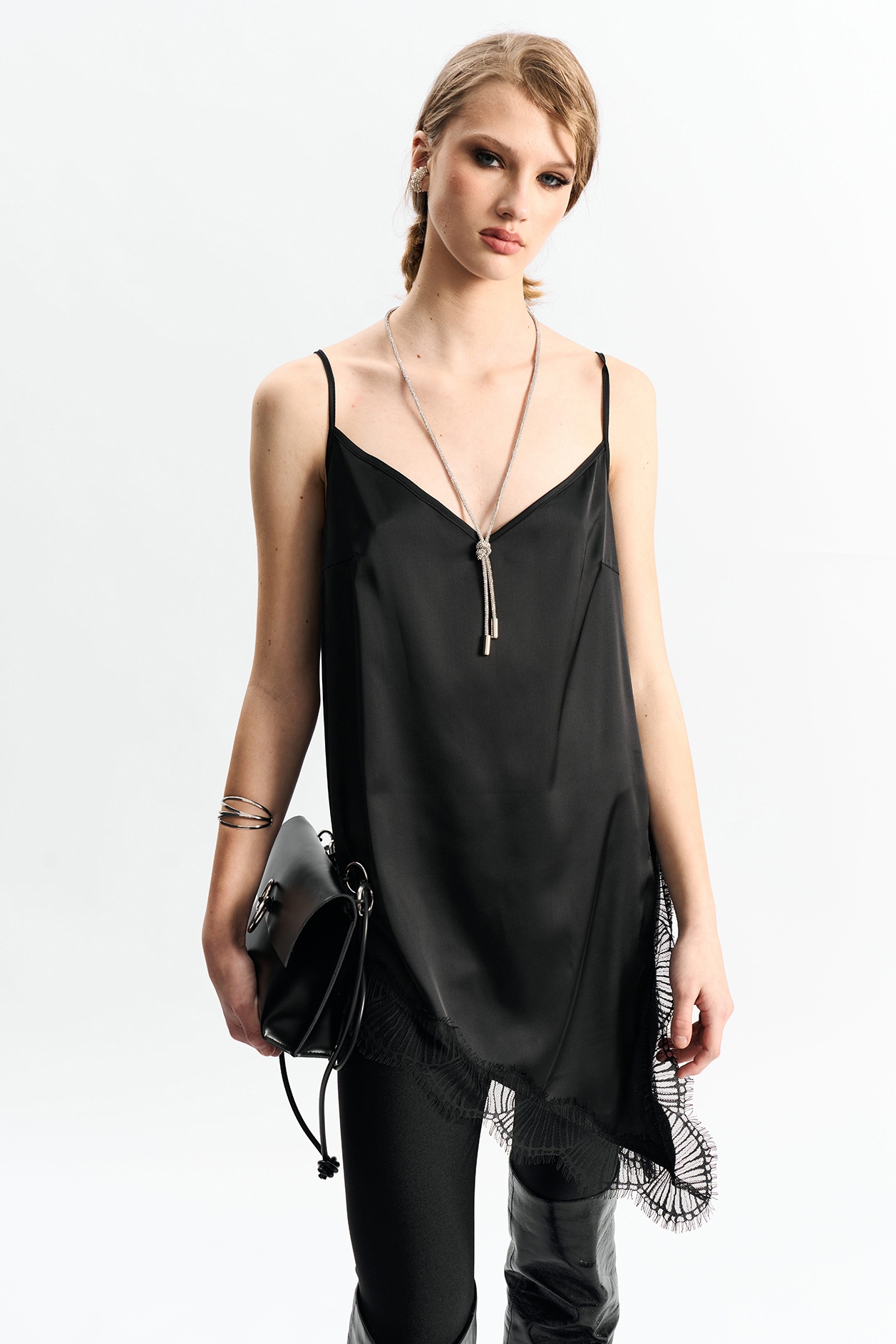 Эксклюзивная удлиненная топ-комбинация, выполненная из высококачественного атласа черного цвета, идеально подойдет для создания элегантного и современного образа. Особенностью данной модели является асимметричный низ, дополненный изысканным французским кружевом, который добавляет изделию утонченности и шарма. Боковой разрез подчеркивает динамичность силуэта, делая его более выразительным. Этот топ-комбинезон станет идеальным выбором для вечернего выхода или особого случая.