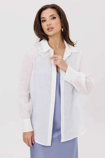 Элегантная женская блуза белого цвета, выполненная из лёгкой прозрачной ткани, добавит изысканности любому образу. Модель прямого силуэта с потайной застежкой на пуговицы идет в комплекте с удобными нагрудными вытачками на передней части и отрезной кокеткой на спинке. Рубашечный воротник с отрезной стойкой и тонкий рукав с одним швом и манжетами по низу делают блузу классическим выбором для офиса или повседневной носки. Особый акцент — декоративный цветок на воротнике, придающий изюминку этой блузе. Низ изделия фигурный, что добавляет легкости и женственности силуэту.