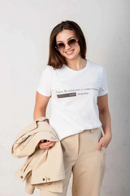 Блуза женская свободного силуэта с втачными одно шовными рукавами и круглой горловиной. По переду декоративная печать.