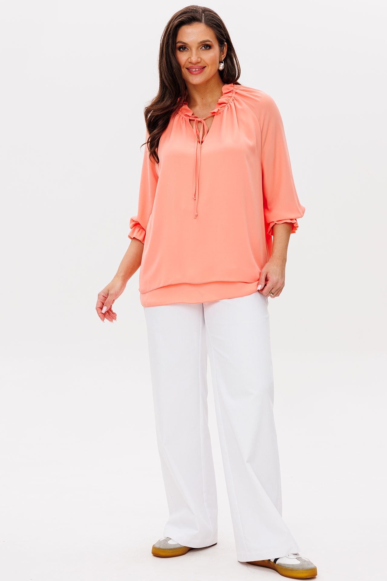 Блуза свободная, двойная. Рукава реглан, по низу со сборкой на резинку. V-образный вырез. Горловина со сборкой на кулису.