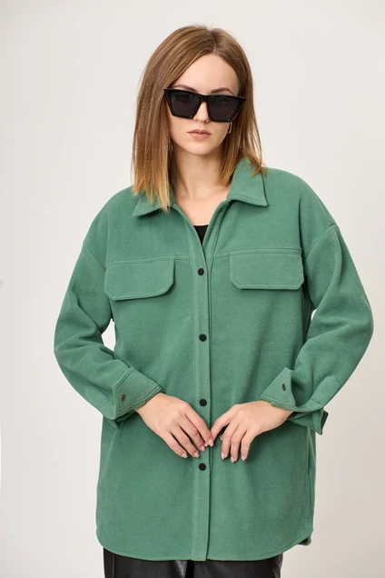 Рубашка свободного кроя из приятного трикотажного полотна селаник (с небольшим мягким начесом). Застежка центральная на кнопки, на уровне груди клапаны. Рукав втачной свободного кроя, спинка с кокеткой. Карманы в боковых швах.