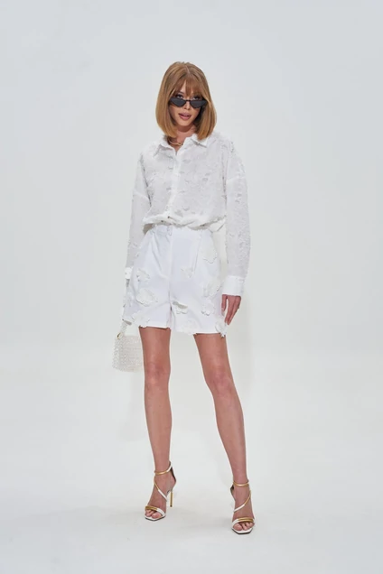 Рубашка выполнена из премиальной фактурной вискозной ткани с дизайнерским переплетением нитей. Ткань создает неповторимый образ и отличает от всех стандартных белых рубашек и блуз.