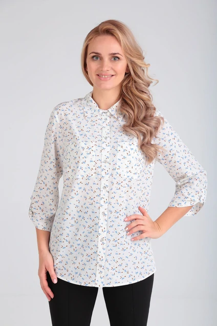 Женская рубашка свободного кроя. Рукава прямые, втачные с патой, застегивающейся на пуговицу. По переду изделия нагрудные вытачки и накладные карманы. Спинка с кокеткой. Воротник изделия со стойкой. Блуза с планкой застегивающаяся на пуговицы.
