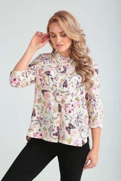 Стильная рубашка свободного покроя с рубашечным воротником. Подрезная кокетка переходит с полочки на спинку. На спинке от уровня кокетки обработана встречная складка. В боковых швах расположены фигурные разрезы. Рукав 7/8 прямой, втачной с манжетой на застёжку. Низ блузки рельефный, обтачной и отстрочен отделочным швом. На спинке заложена встречная складка.