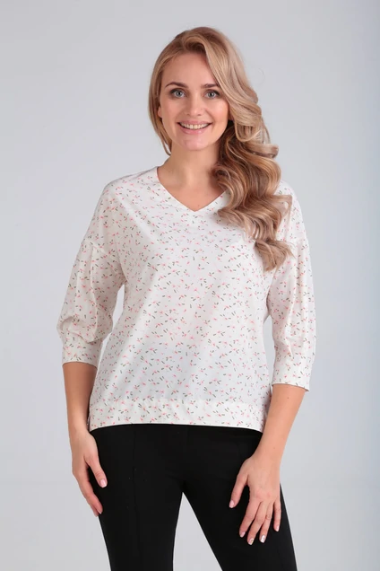 Блуза свободного кроя со спущенными плечами и v-образным вырезом горловины. Спинка стачная по центру, с разрезом и навесной петлей на застежку. Рукав прямой втачной cо складками. По верхнему срезу рукава заложены складки, по нижнему - застрочены. Воротник со стойкой. Низ изделия фигурный: спинка длиннее переда. Горловина и низ рукава обработаны широкой обтачкой.