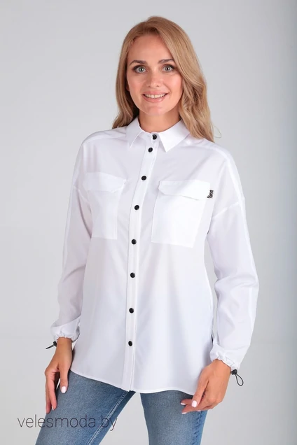 Стильная рубашка свободного кроя с цельнокроеной кокеткой полочки и спинки, со спущенной линией плеча. Рубашка с накладными карманами и фигурными клапанами. Модель прямого силуэта, c рубашечным воротником и длинным рукавом на узкой манжете с эластичным шнурком и фиксатором. В боковых швах разрезы. По спинке заложена и застрочена бантовая складка. По переду блузы застежка на пуговицы.