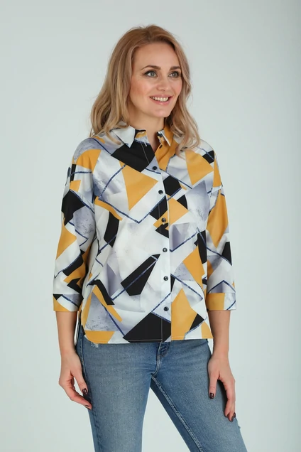 Стильная рубашка свободного кроя с цельнокроеной кокеткой полочки и спинки, со спущенной линией плеча. Модель прямого силуэта, c рубашечным воротником и рукавом с притачной манжетой. Низ изделия фигурный , обработан окантовкой. Перед короче спинки. По спинке заложена и застрочена бантовая складка. По переду блузы планка на пуговицах.