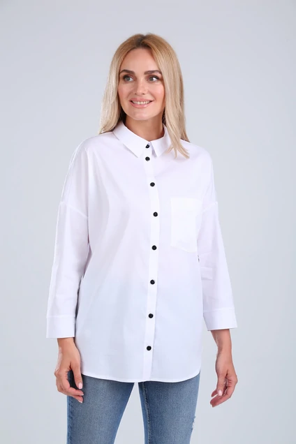 Стильная рубашка свободного кроя с центральной планкой на застежку (8 пуговиц) по полочке, с накладным карманом на левой полочке. По нижнему срезу кармана, в углу, полукольцо, вдето в отделочную ленту. Спинка изделия цельная, по центру от горловины застрочена встречная складка, на которую настрочена отделочная лента с полукольцом. Плечо изделия спущено. Рукав 7/8 прямой с широкой манжетой. Воротник со стойкой. Низ изделия фигурный отстрочен отделочной строчкой.