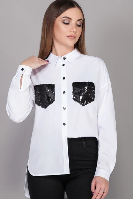 Стильная рубашка свободного кроя с цельнокроеной кокеткой полочки и спинки, со спущенной линией плеча. Модель прямого силуэта, c рубашечным воротником и рукавом на манжете. Линия низа имеет асимметричную форму, спинка длиннее, чем полочка. Низ изделия обработан окантовкой. По спинке заложена и застрочена бантовая складка. По переду блузы планка на пуговицах и декоративный карман из пайеток.