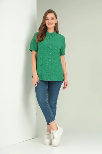 Стильная рубашка свободного покроя с рубашечным воротником. Подрезная кокетка переходит с полочки на спинку. На спинке от уровня кокетки обработана встречная складка. В боковых швах расположены фигурные разрезы. Рукав короткий, прямой, втачной с манжетой. Низ блузки рельефный, обтачной и отстрочен отделочным швом. На спинке заложена встречная складка.