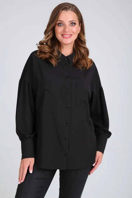 Стильная рубашка свободного кроя со спущенной линией плеча и центральной застежкой на петли и пуговицы. Модель c рубашечным воротником и рукавом на манжете. Рукав втачной одно шовный, присборенный по линии оката и нижнему срезу. Рукав с притачной широкой манжетой на застежку петли-пуговицы.По переду настрочены фигурные накладные карманы. Спинка цельная.