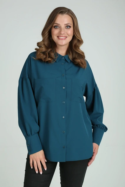 Стильная рубашка свободного кроя со спущенной линией плеча и центральной застежкой на петли и пуговицы. Модель c рубашечным воротником и рукавом на манжете. Рукав втачной одно шовный, присборенный по линии оката и нижнему срезу. Рукав с притачной широкой манжетой на застежку петли-пуговицы.По переду настрочены фигурные накладные карманы. Спинка цельная.