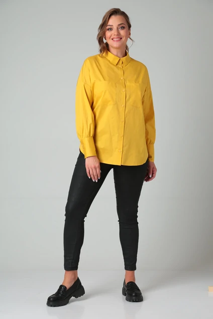 Стильная рубашка свободного кроя из хлопко содержащей ткани со спущенной линией плеча и центральной застежкой на петли и пуговицы. Модель c рубашечным воротником и рукавом на манжете. Рукав втачной одно шовный, сборка по нижнему срезу. Рукав длинный с притачной широкой манжетой на застежку (пуговицы). По переду настрочены фигурные накладные карманы. Спинка цельная. Размеры 46 Длина по спинке: 66.5 см