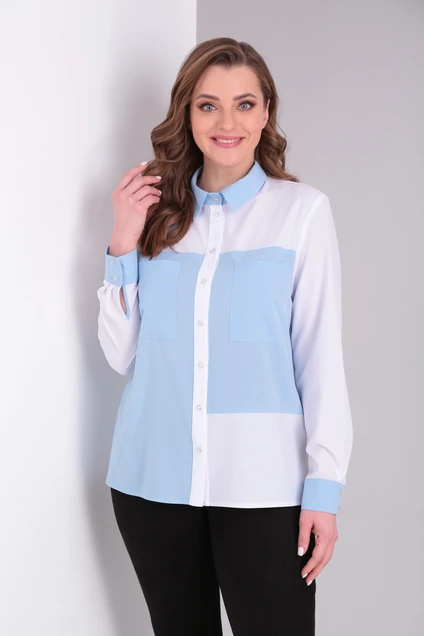 Стильная рубашка свободного кроя с центральной застежкой на петли и пуговицы. По переду изделия накладные карманы. Модель c рубашечным воротником, отрезная по переду и спинке. Рукав втачной одно шовный, длинный с притачной манжетой на застежку (пуговицы). Перед рубашки с отрезной кокеткой, левая полочка снизу имеет подрез. По боковым швам разрезы. Спинка с отрезной кокеткой. Рубашка выполнена из тканей двух видов для придания оригинального внешнего вида.