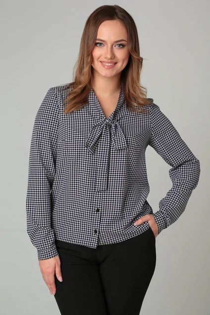 Стильная блузка прямого силуэта. По переду блузка с нагрудными вытачками, V-образным вырезом и планкой с застежкой на пуговицы. Воротник стойка переходящий в завязывающийся бант. Спинка цельная. Рукав длинный, прямой, втачной с манжетой по низу.