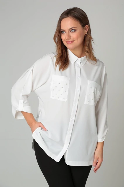 Элегантная блузка свободного силуэта с цельнокроеным рукавом и рубашечным воротником на стойке. Перед с нагрудными карманами декорированными жемчужинками и центральной застёжкой на планку от воротника до низа. Карманы накладные. Верх кармана подогнут, с отделочной строчкой. Спинка со средним швом, по бокам закруглённые разрезы. Рукав с патой застёгивающейся на пуговицу.