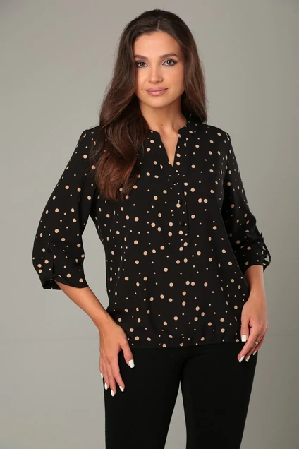 Женская блузка свободного силуэта с втачным рукавом. По переду изделия нагрудные вытачки и центральная планка, застегивающаяся на пуговицы. На левой полочке накладной карман. Спинка с кокеткой переходящей на полочку. По центру спинки сборка. Рукав короткий, прямой, втачной с патой на застежку пуговицу. По горловине плоско лежащий воротник-стойка. Низ блузки на резинке.