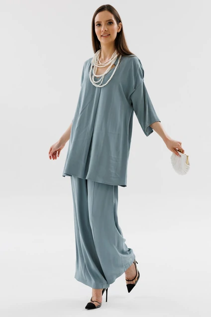 Элегантная блуза с V-образным вырезом горловины и воротником стойкой, без застёжки. Спинка и полочка цельные, на полочке заложена односторонняя складка. Линия плеча приспущенаи. Рукав три четверти со складками.