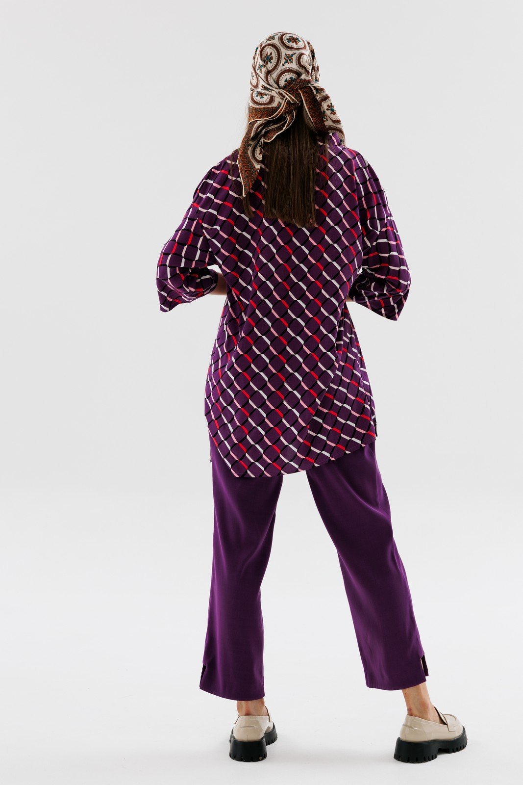 Элегантная блуза с V-образным вырезом горловины и воротником стойкой, без застёжки. Спинка и полочка цельные, на полочке заложена односторонняя складка. Линия плеча приспущенаи. Рукав три четверти со складками.