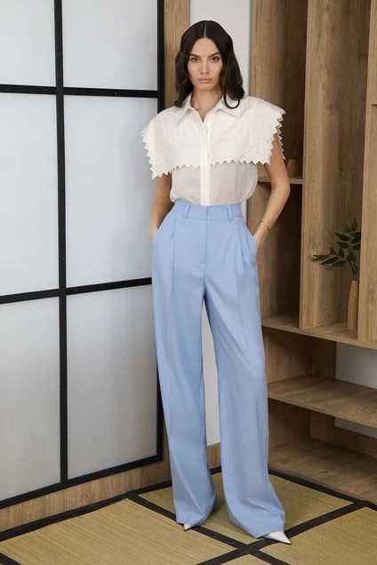 Стильная блуза прямого кроя длиной до середины бедра, выполнена из тонкого льна (рами) Центральная “супатная” застежка доверху на петли и пуговицы. Отлетная кокетка с дизайнерской вышивкой по передней и задней части изделия. Рубашечный воротник. Изделие без рукавов. Спинка прямая.