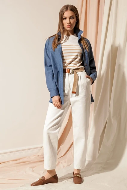 Стильная джинсовая рубашка из тонкой вискозной ткани прямого силуэта с застежкой на планку с отделочными пуговицами в натуральном стиле. Перед рубашки с большими накладными карманами . Спинка с горизонтальной кокеткой и бантовой складкой от нее. Рукава втачные с манжетами с застежкой на пуговицы. Джемпер из приятного тонкого трикотажа прямого силуэта. Горловина оформлена аккуратной планкой.