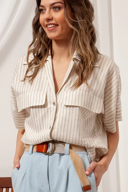 Стильная рубашка из льна в полоску свободного кроя с цельнокроеными рукавами. Горловина с отложным широким воротником и небольшими лацканами. Застежка на пуговицы в натуральном стиле. По переду два больших клапана. Спинка с отрезной горизонтальной кокеткой.