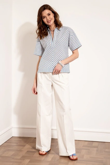 Стильная рубашка из льна в полоску свободного прямого силуэта со спущенной линией плеч и рукавами выше локтя. Горловина оформлена отложным воротником на стойке и отрезными планками спереди. По низу переда декоративная отрезная планка с небольшими разрезами по бокам.