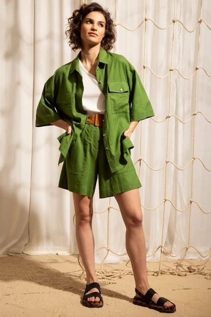 Льняная рубашка свободного силуэта, спереди накладные карманы.