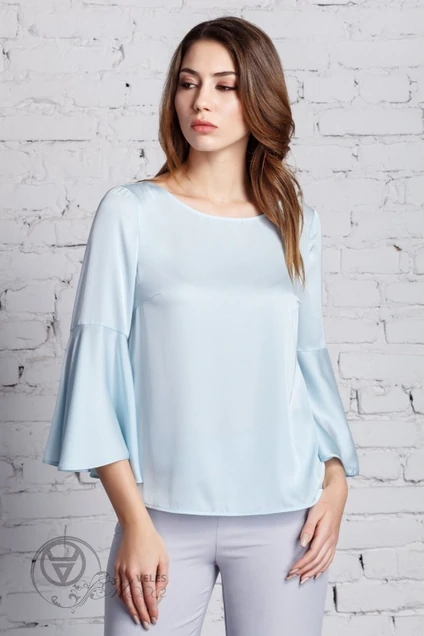 Элегантная блузка слегка расширенного силуэта, с горловиной "лодочка", втачными рукавами, по низу которых притачные воланы длиной до локтя.