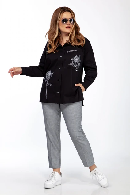 Блузка женская, прямого силуэта, длиной до линии бедер, со спущенной проймой, с втачными рукавами, с втачным воротником, с центральной сквозной застежкой на 7 петель и 7 пуговиц, с разрезами в боковых швах. Детали переда блузки с кокетками, с притачными планками. На левой детали переда вверху расположен накладной карман с аппликацией, на правой детали внизу - аппликация-вышивка. Деталь спинки блузки со средним швом, по центру вверху – декоративный элемент с аппликацией. Рукава втачные одношовные, с притачными манжетами с застежкой на 1 петлю и 1 пуговицу. По швам притачивания манжет закладываются по 1 складке. Разрезы рукавов обработаны окантовкой. Воротник-стойка втачной.