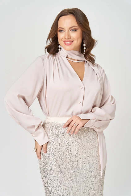 Блузка выполнена из мягкой струящейся ткани с матовым блеском. Стойка и V-образный вырез горловины. Блузка прямого силуэта, с отрезными кокетками на полочке, от которых заложена сборка, застежка на пуговицы. Разрезы по боковым швам. Рукав одношовный, с манжетой фигурной формы. Сьемное украшение выполнено из бусин, сьемное. В комплекте галстук-пояс. Длина блузки 63.5см, длина рукава 63см