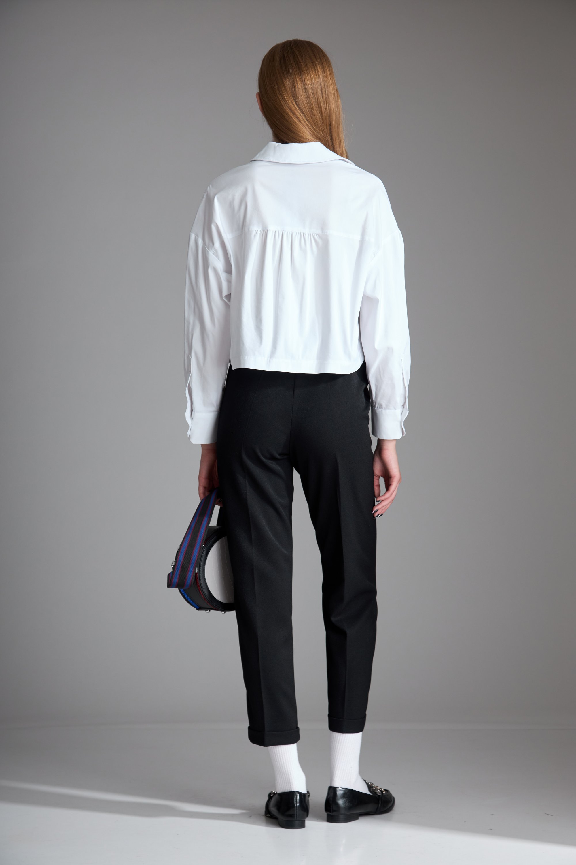 Блуза из хлопкосодержащей ткани . Блуза укороченная, свободного силуэта. Воротник рубашечный на стойке. Застежка по переду на пуговицы. На передних полочках большие накладные карманы. Рукав со спущенным плечом. Верх рукава выполнен со сборкой, внизу с боковым разрезом и притачной манжетой на пуговице. По спинке отрезная кокетка со сборкой по центру. Длина изделия по центру спинки 47 см.