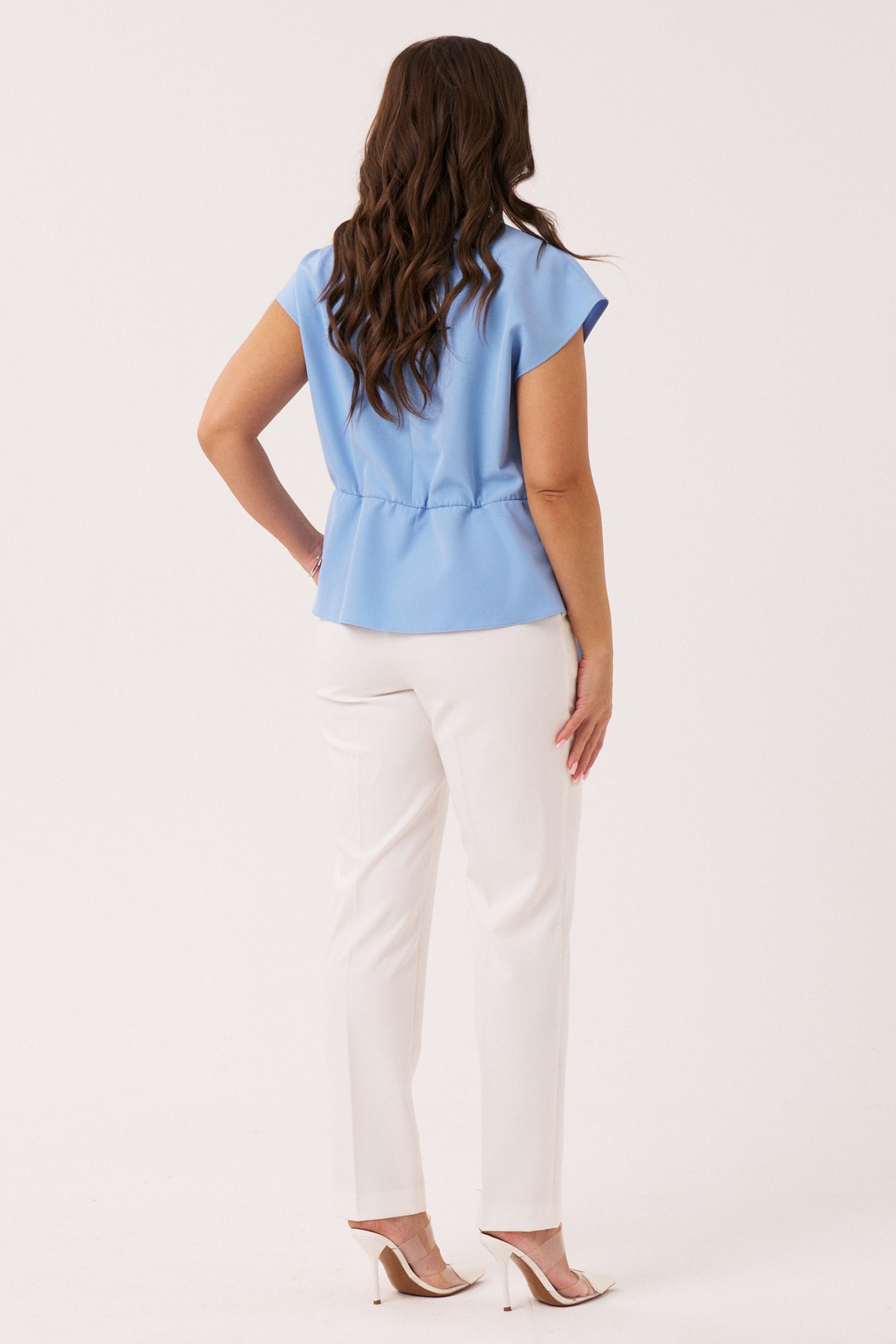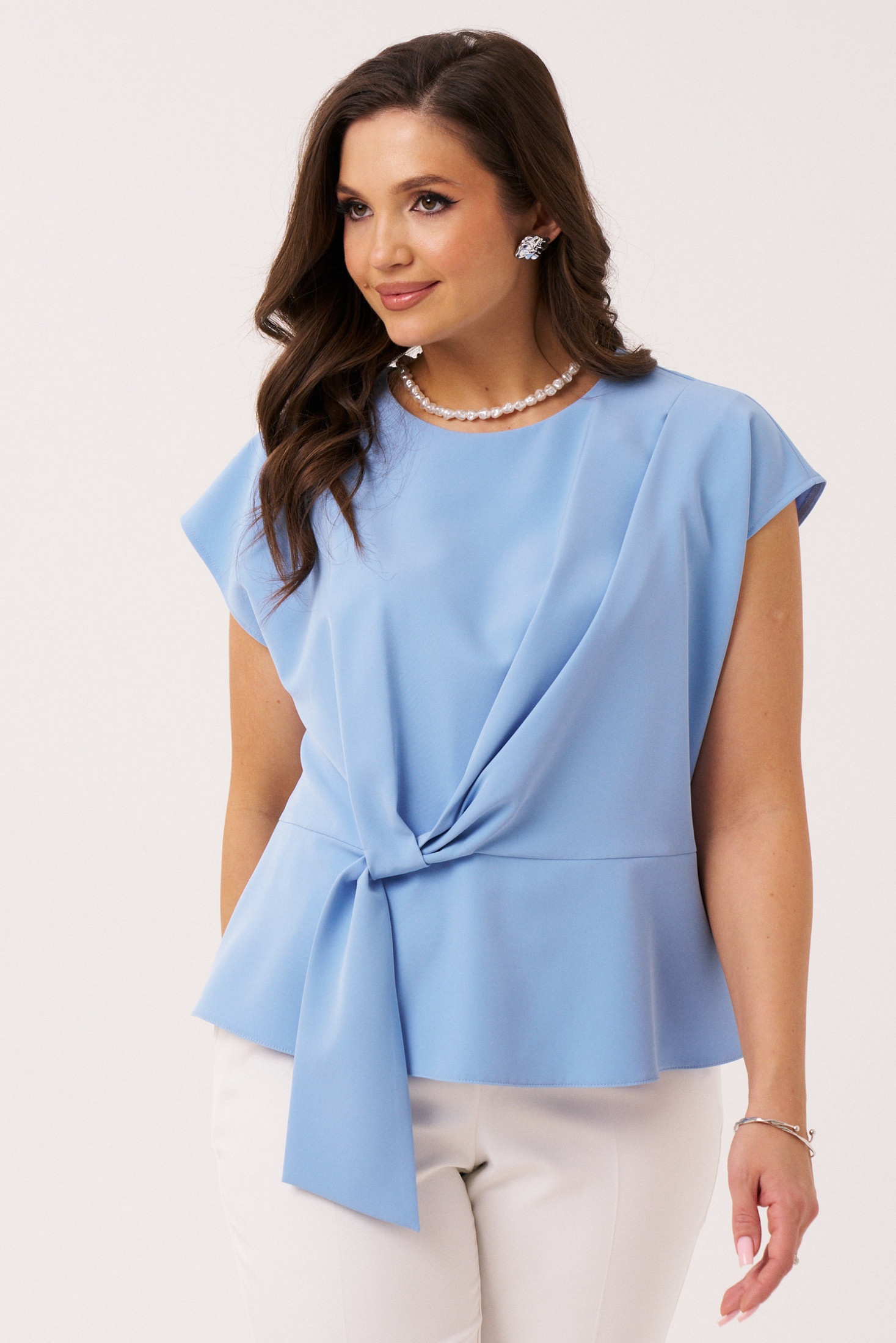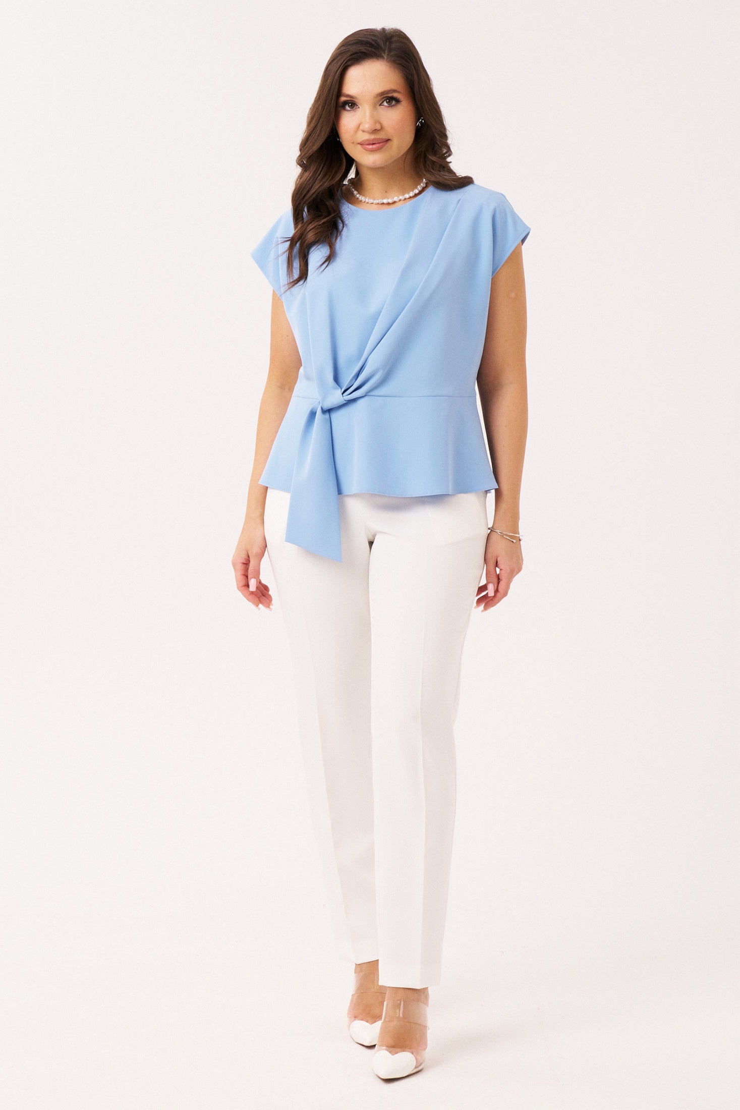 Блузка женская из смесовой ткани — идеальный выбор для тех, кто ценит сочетание стиля, комфорта и универсальности. Благодаря свободному крою и уникальному дизайнерскому решению — складке на плечевом шве и декоративному узлу — блузка смотрится элегантно и нарядно. Спинка изделия выполнена со средним швом и застежкой-капелькой на пуговицу, что добавляет изысканности, а вставка на резинке по талии создает легкую сборку, выгодно подчеркивающую силуэт. Цельнокроеные рукава и округлая горловина придают модели завершенный классический вид.