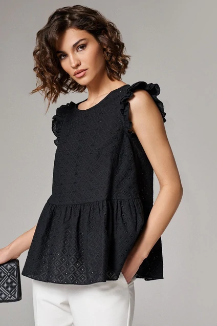 Блуза женская из хлопковой ткани для повседневной носки. Блуза свободного кроя с коротким рукавом, Низ блузы оформлен рюшей. Рукав оформлен рюшей. Горловина круглая.