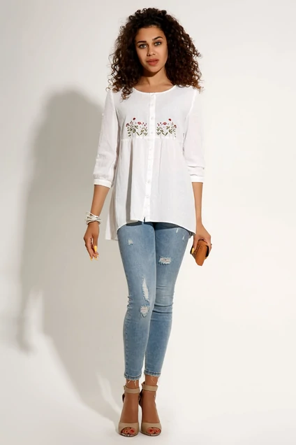Красивая блузка женская - удобная повседневная вещь, в которой вы всегда будете выглядеть элегантно. Белая хлопковая ткань хорошо пропускает воздух и подходит даже для знойного лета. Вышитая цветочная композиция создаст романтичный образ, добавив легкие весенние нотки. Блузка белая женская дополнена отрезной кокеткой по линии груди и расклешенной нижней частью асимметричного кроя. Изготовлена из 100% натурального хлопка - мягкой, воздухопроницаемой и гигроскопичной ткани, которая приятна к коже и комфортна в носке. Блузка женская нарядная с укороченным рукавом3/4 на притачной манжете. Расширяющаяся нижняя часть присобрана у линии среза в мягкие мелкие складки.