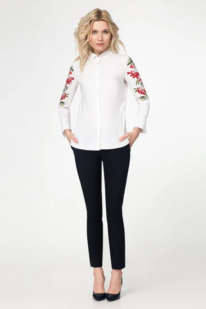Стильная блузка из хлопковой ткани. В блузке сделан акцент на офисный стиль с нотками роскоши, этого удалось достичь благодаря декору "вышивка рябина". Блузка полуприлегающего силуэта, с застежкой на потайную планку, с нагрудными вытачками по переду, на спинке кокетка, рукава удлиненные на манжете, на рукавах яркая вышивка "рябина".
