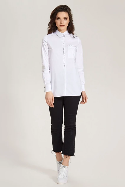 Стильная удлиненная блузка выполнена из хлопковой ткани. Блузка полуприлегающего силуэта, с длинными рукавами на манжете, с сорочечным воротником на отрезной стойки. Застежка по переду на потайные петли и пуговицы. Спинка декорирована имитацией планки с петлями и пуговицами, идущей от кокетки. Изящество модели придает декор, нанесенный по планке и по карману на переде. Такая блузка отлично впишется как и в строгий дресс-код, так и замечательно будет сочетаться с джинсами в стиле кэжуал. 42 Блузка: Длина изделия - 72см, Длина рукава - 62см, Обхват шеи - 39см, Ширина плеча - 13,5см, Ширина по бедрам - 50см, Ширина по груди - 48см, Ширина рукава - 16см 44 Блузка: Длина изделия - 72см, Длина рукава - 62см, Обхват шеи - 39,5см, Ширина плеча - 13,5см, Ширина по бедрам - 52см, Ширина по груди - 50см, Ширина рукава - 16,5см 46 Блузка: Длина изделия - 72см, Длина рукава - 62см, Обхват шеи - 40см, Ширина плеча - 14см, Ширина по бедрам - 54см, Ширина по груди - 52см, Ширина рукава - 17см 48 Блузка: Длина изделия - 72см, Длина рукава - 62см, Обхват шеи - 40,5см, Ширина плеча - 14см, Ширина по бедрам - 56см, Ширина по груди - 54см, Ширина рукава - 17,5см 50 Блузка: Длина изделия - 73,5см, Длина рукава - 62см, Обхват шеи - 41см, Ширина плеча - 14см, Ширина по бедрам - 58см, Ширина по груди - 56см, Ширина рукава - 18см