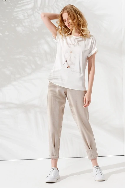 Летняя женская блузка с коротким рукавом – нарядная и одновременно сдержанная. Ее можно надеть на прогулку, встречу, сочетая с брюками разных видов и удобной обувью. Женская футболка белого цвета с принтом универсальная и не притязательна в выборе аксессуаров. Стильная трикотажная блузка с круглым выкатом выполнена в прямом крое. На рукавах имеются небольшие отвороты.