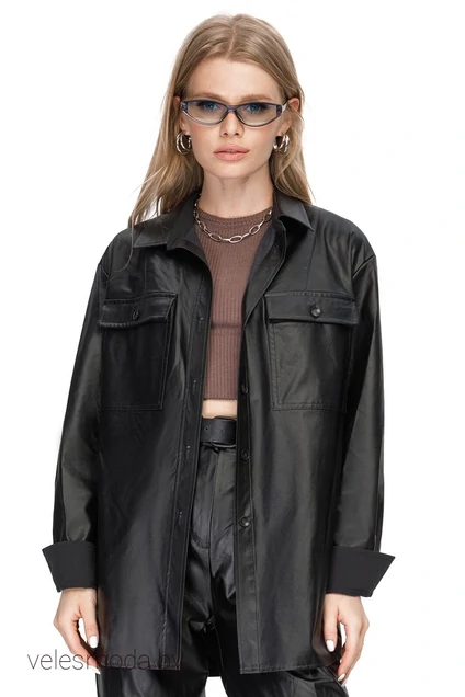Свободная рубашка из экокожи. Детали: прямой силуэт, накладные карманы, нагрудные вытачки, рубашечный воротник, кокетки спинки, застежка на петли и пуговицы, рукава втачные длинные на манжетах, фигурный низ